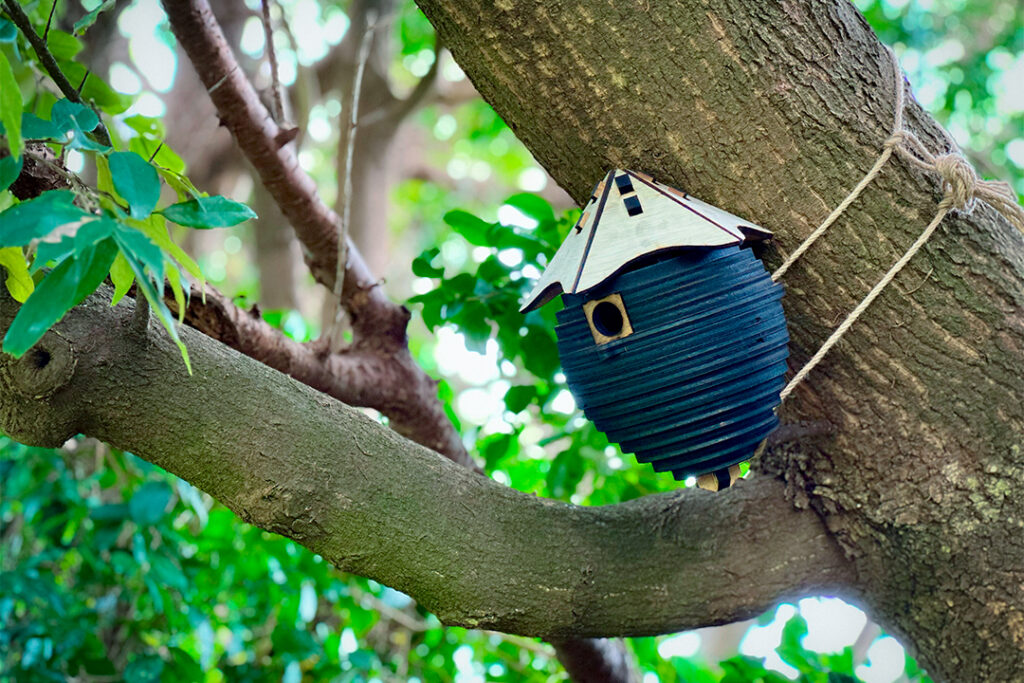 ヤマガラのためにデザイン・制作した巣箱を敷地内に設置