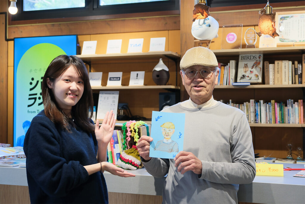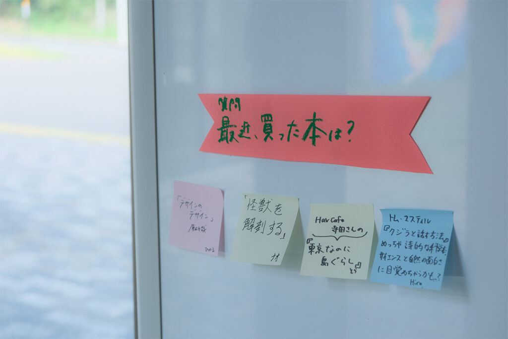 たとえば、会場の一角には似顔絵ブースを設けて、本と一緒にイラスト交流が生まれるようにしたり、「こんな気分になれる本、知りませんか?」「あの頃、よく読んだ本、お気に入りだった本は?」といった本にまつわる問いをホワイトボードに掲示し、来場者の方に付箋で自由に書き込んでもらったり。さらに、お茶やお茶菓子も用意して、ちょっと一息つきながら話が弾むような雰囲気づくりを心がけました。